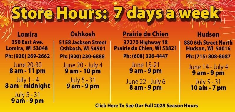 Fireworks Nation has several locations throughout Wisconsin, thus providing convenience for customers to find their ideal pyrotechnic collection. The stores are in the towns of Lomira, Oshkosh, Prairie du Chien, and Hudson, each serving a region of the state.
